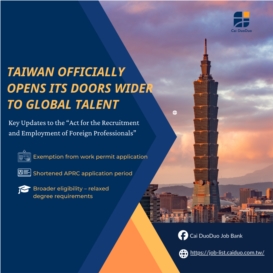 On August 29, 2025, the amended Act for the Recruitment and Employment of Foreign Professionals (外國專業人才延攬及僱用法) passed its third reading in the Legislative Yuan, marking a major milestone in Taiwan’s strategy to globalize its workforce. From 2025 onward, Taiwan is entering a new era that is more open, more flexible, and more competitive, aiming to become one of Asia’s top destinations for global professionals. The amendments cover a wide range of groups, including: High-level international professionals Overseas Chinese and foreign students graduating in Taiwan Digital nomads The new policies address employment conditions, residency rules, and social benefits, creating a more attractive and supportive environment for global talent. Additionally, on November 21, 2025, the Executive Yuan officially announced the implementation timeline for major clauses, including rules that directly affect international graduates, job-seeking processes, and APRC applications.   🔎 I. Key Amendments Confirmed by the Executive Yuan According to Executive Yuan Notice 院臺教字第1141030485B號, the new law will take effect in two phases: January 1, 2026: Most provisions become effective June 30, 2026: Article 4 (Section 4, Item 4), Article 28, and Article 29 begin implementation Below are the most important changes affecting international graduates and foreign professionals:   1. No work permit required during the 延期居留 (post-graduation residency extension) - Effective Jan 1, 2026 (Article 12) Foreign nationals who graduate with an associate degree or higher in Taiwan, and obtain 延期居留 (the post-graduation residency extension), may work without applying for work permit. This will be taken effect from January 1st, 2026. ➡️This is one of the biggest wins for foreign graduates. Reduce financial pressure during the job application process Have more opportunities to try different jobs and industries, hence find out the most suitable and stable job in Taiwan   2. Degree-based residency deduction for APRC eligibility (Article 18, Paragraph 4) If you studied in Taiwan and hold a degree from an accredited college or university, you may deduct part of the required residency period when applying for an APRC: For Foreign Professionals (外國專業人才): PhD → deduct 3 years Master’s → deduct 2 years Bachelor / Associate → deduct 1 year For Foreign Special Professionals (外國特定專業人才): PhD → deduct 2 years Master’s → deduct 1 year ➡️ Degree deductions cannot be combined. 🧭 II. Four Major Policy Changes at a Glance 1. Expanded eligibility & relaxed academic requirements The exemption from the “2-year work experience” requirement now applies to graduates from Top 1,500 universities worldwide (previously only Top 500). Four new fields are added to the "Foreign Special Professionals" category: Environmental Science, Biotechnology, Digital Technology, Sports Bilingual schools (high school level and below) may hire foreign teachers specializing in arts, activities, or languages. International graduates may work for 2 years during 延期居留 without applying for a work permit.   2. Extended visa options for Digital Nomads Eligible applicants may obtain a 6-month stay, renewable every 6 months, up to a maximum of 2 years. Applicable to spouses and children under 18, making Taiwan more friendly for relocating families.   3. Easier APRC pathway for long-term residency Foreign special professionals earning NTD 6 million or more annually may apply for APRC after 1 year of residency. Degree deductions further shorten the APRC timeline (as detailed above).   4. More comprehensive labor and social protection Foreign professionals may participate in the new labor pension system (勞退新制) without needing APRC. APRC holders gain access to: Employment insurance Long-term care services after 10 years of residency Disability support Spouses of foreign special professionals may apply for a work permit directly, without employer sponsorship. 🎯 III. What This Means for Foreign Job Seekers in Taiwan Unlike previous announcements that focused on employer benefits, this amendment directly improves the experience of foreigners searching for jobs, staying after graduation, and planning long-term life in Taiwan. The biggest advantages for job seekers: ✅ Working immediately after graduation without a permit Beginning January 1, 2026, foreign graduates no longer face delays or rejection due to work permit procedures. ✅ Easier long-term settlement Degree conversion and shortened APRC timelines reduce the uncertainty of long-term residency planning. ✅ More job opportunities Broader talent definitions + growing demand in tech, biotech, digital, AI, education, and semiconductor industries mean more paths to employment. ✅ A more friendly system for newcomers From visa to pension to long-term care, Taiwan is gradually aligning with international labor standards. 🏁 IV. Conclusion: New Law = New Opportunities for International Talent The 2026 amendment to Taiwan’s Foreign Talent Act is not just legal reform - it represents Taiwan’s commitment to helping foreign talent come, stay, grow, and build a future here. Whether you are: A foreign student preparing to graduate A job seeker exploring opportunities in Taiwan Someone planning long-term residency A digital nomad looking for stability 👉 Now is one of the most favorable times to pursue a career in Taiwan. If you’re looking for job opportunities suited for foreign professionals, follow: Cai DuoDuo Job Bank – Taiwan’s Job Bank for Foreigners https://job-list.caiduo.com.tw/